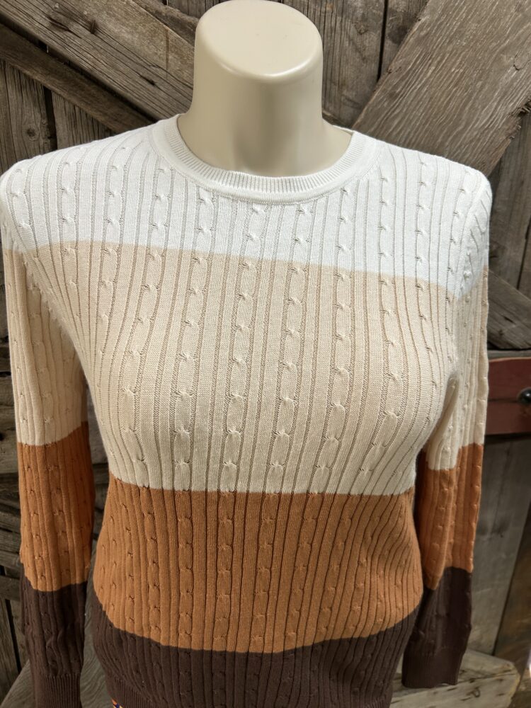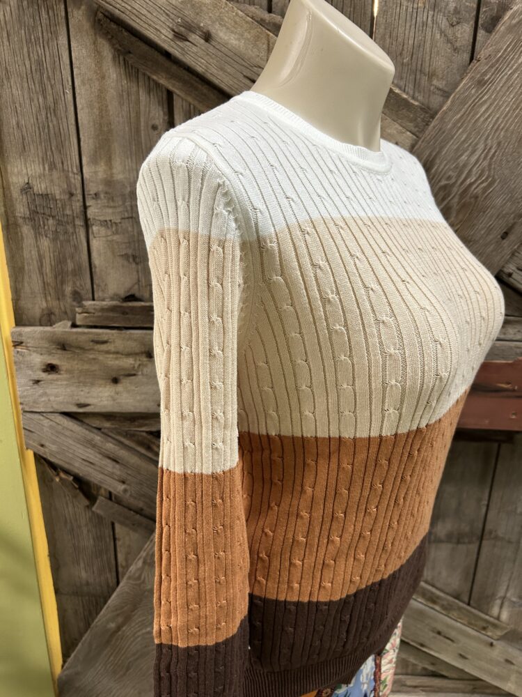 This is a Sweater from the Little Daisy company. It is a color block cable knit round neck sweater. The coloring on this sweater is multiple shades of brown.